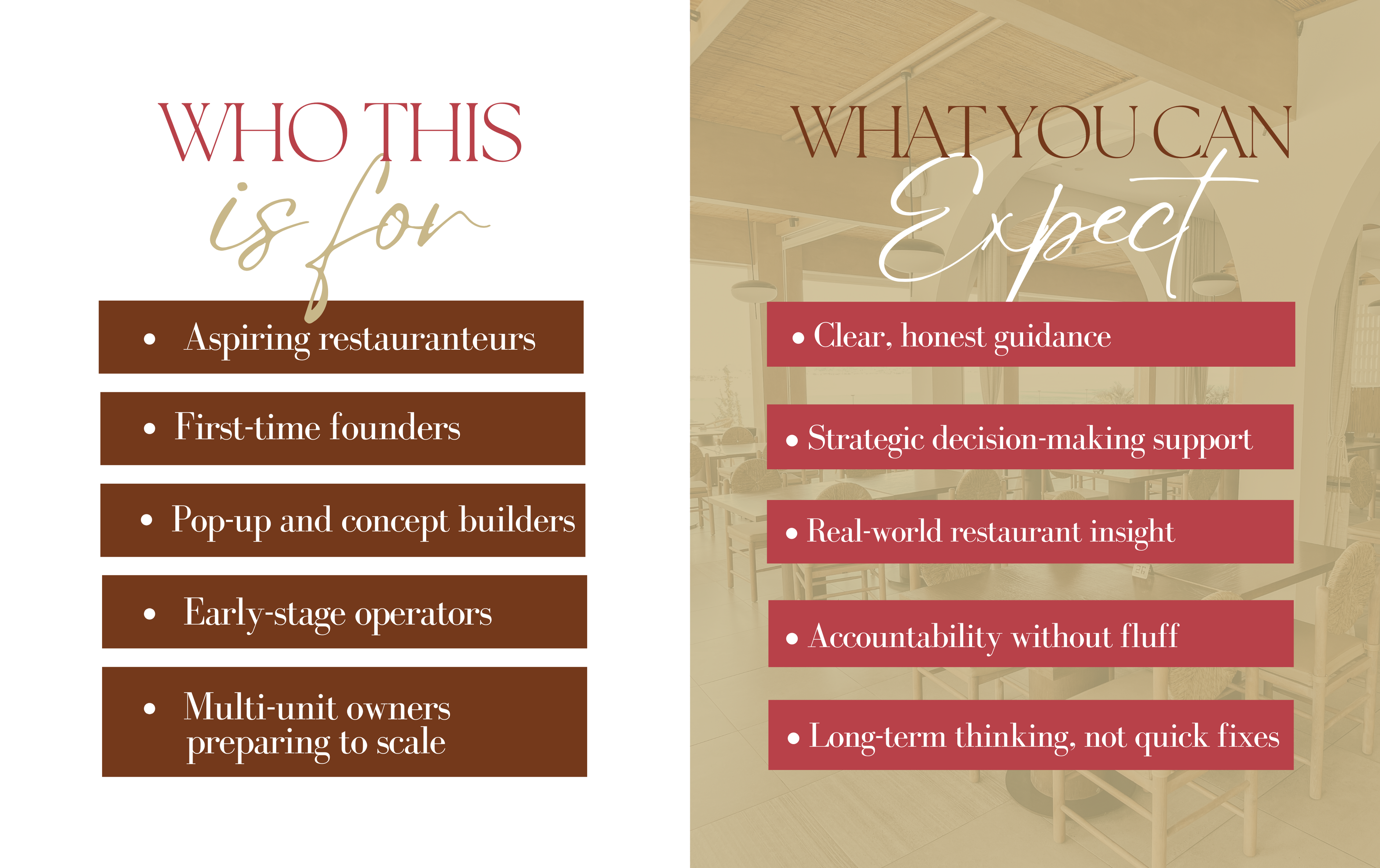 My restaurant coaching and advisory services are designed for founders and operators who want to build with intention, avoid costly missteps, and create brands positioned for long-term success. Whether you’re at the idea stage or preparing to scale, I offer strategic guidance rooted in real operational experience.
